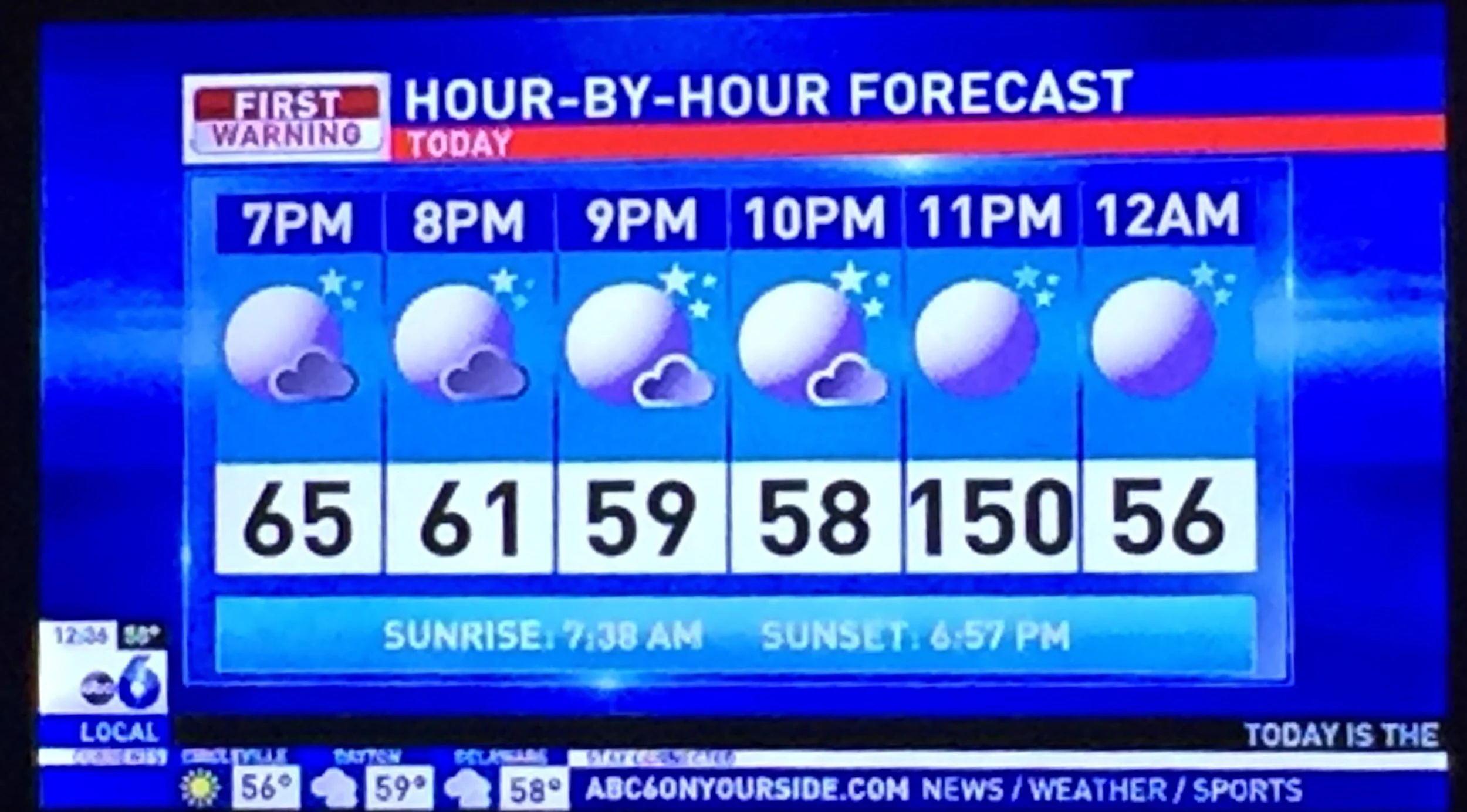 At 10PM the temps are expected to be 58 degrees, but don't dare think about sleeping with the windows open. Why? Because at 11PM, the temp jumps up to 150.