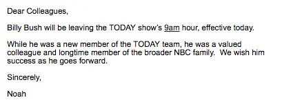 An internal memo went out to the staff at the Today Show informing them that Billy Bush is no longer with the show.