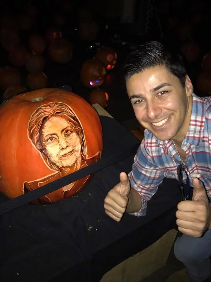 WPIX Reporter Dan Mannarino posted a picture of him posing with a pumpkin carved to look like Hillary Clinton. Dan gives either the pumpkin or Clinton two thumbs up. Dan did not post any pictures of him posing with a Trump pumpkin. It's right here that I could make an orange joke about Trump and pumpkins, but I'm trying to show my mature side, so I won't.