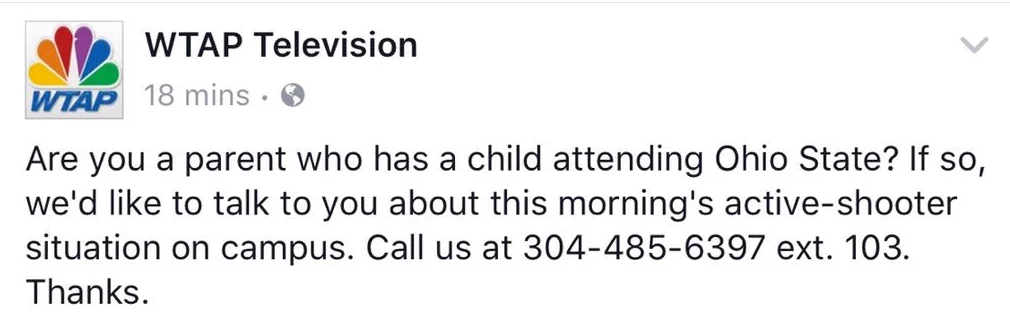 Once again, WTAP in Parkersburg illustrates just why viewers distrust the media. Shortly after an attacker slammed his car into students and then started stabbing them with a butcher knife at Ohio State, some idiot at WTAP sent out this tweet. Forget the fact that it was not an 'active shooter situation', the insensitivity is astounding.