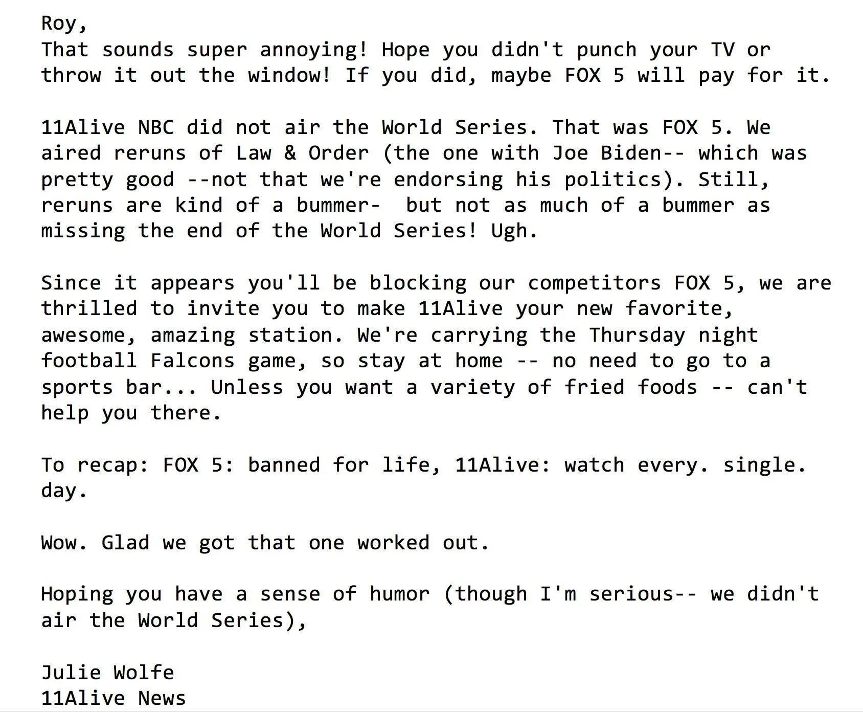 But, WXIA Social Media Director Julie Wolfe took time to respond to the angry viewer and it was a classic: