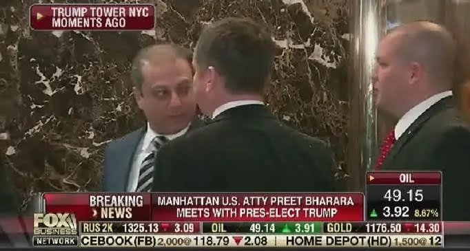 Yesterday, CNBC reported on screen that Manhattan U.S. Attorney Preet Brahara will be meeting at Trump Tower tomorrow while reading “Trump is going to meet on Wednesday with Manhattan U.S. Attorney Preet Bharara…”