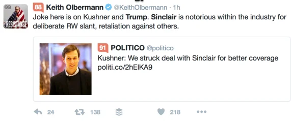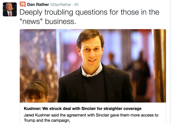 According to a report by Politico, Kushner said the agreement with Sinclair gave them more access to Trump in exchange for Sinclair running Trump interviews across the country without commentary. Kushner said Sinclair, in states like Ohio, reaches 250,000 viewers while CNN only reaches about 30,000.