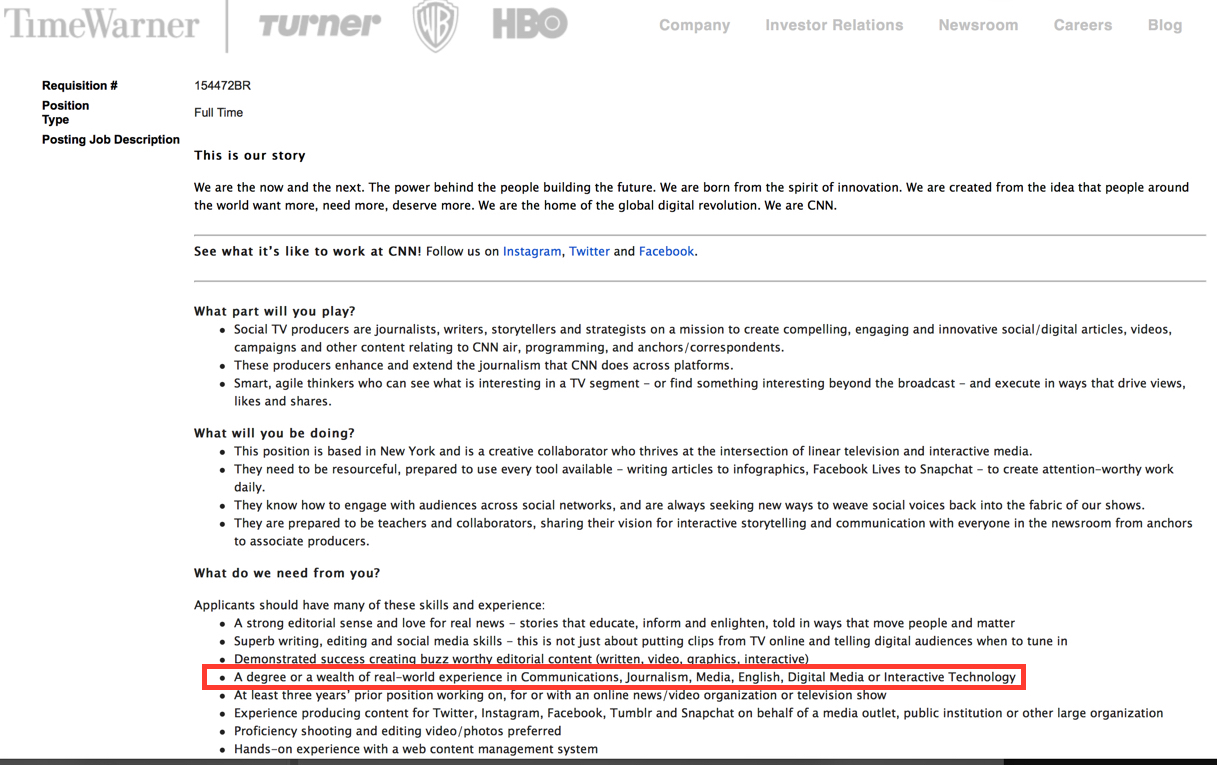 Coincidentally, CNN is advertising for a Digital Producer of Social TV. But here's what concerns us. Take a look at the requirements; "a degree OR a wealth of real-world experience". So, if you have the degree, you don't need a wealth of real-world experience? We're figuring that's how the previous person got fired - no 'real-world experience - OR - common sense.