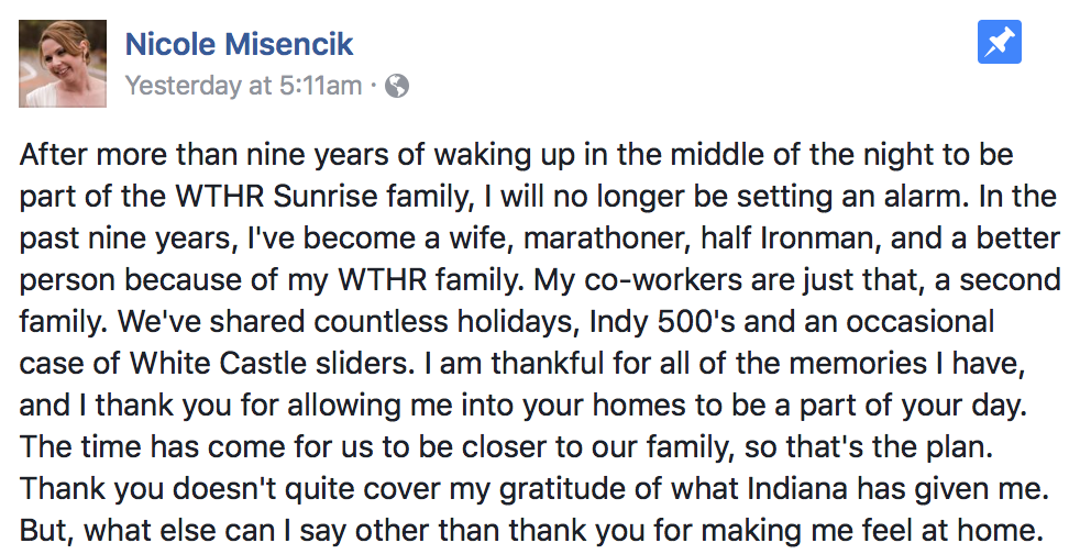 WTHR Morning Weather Anchor Nicole Misencik announced that she is leaving the station.