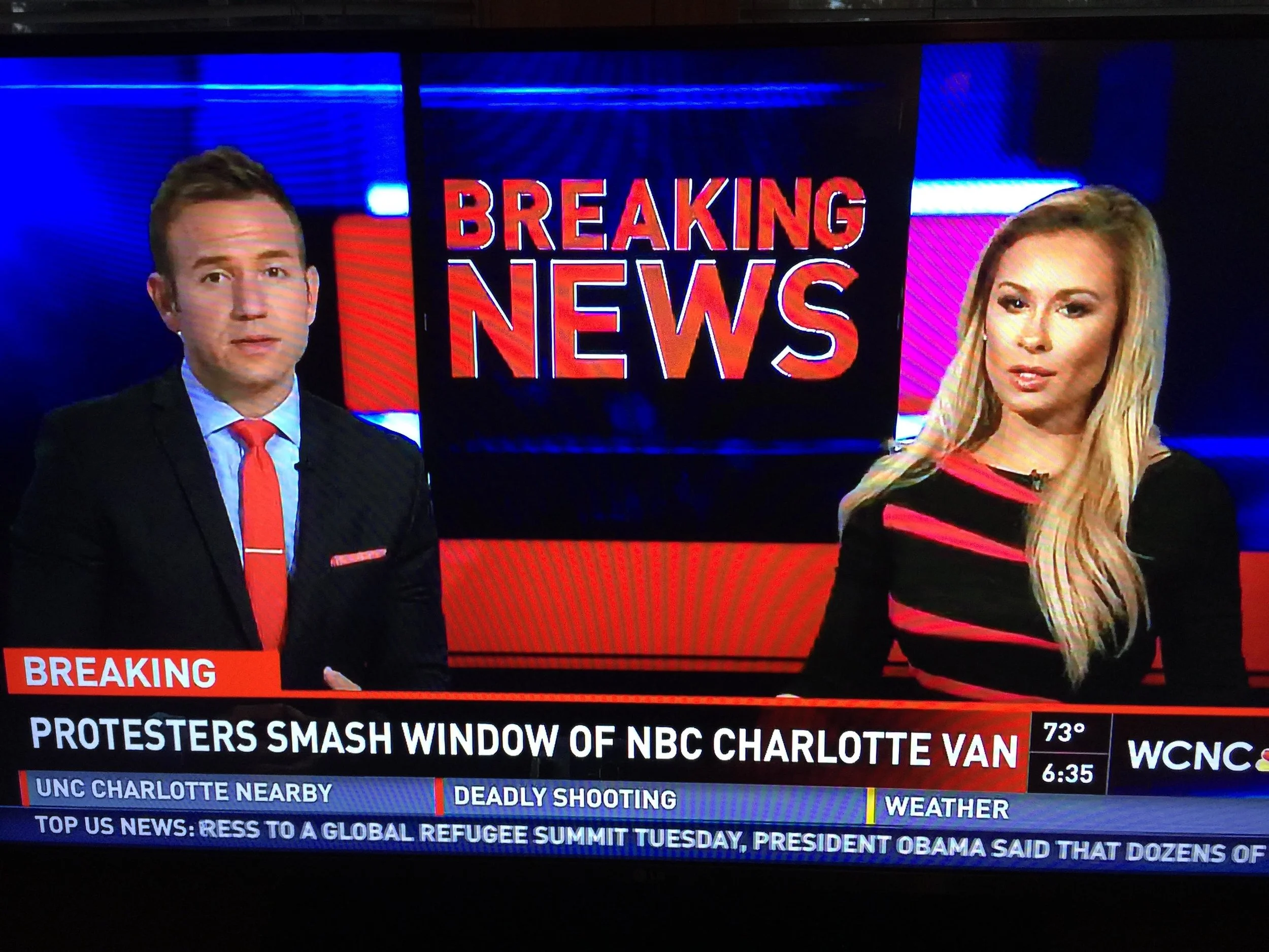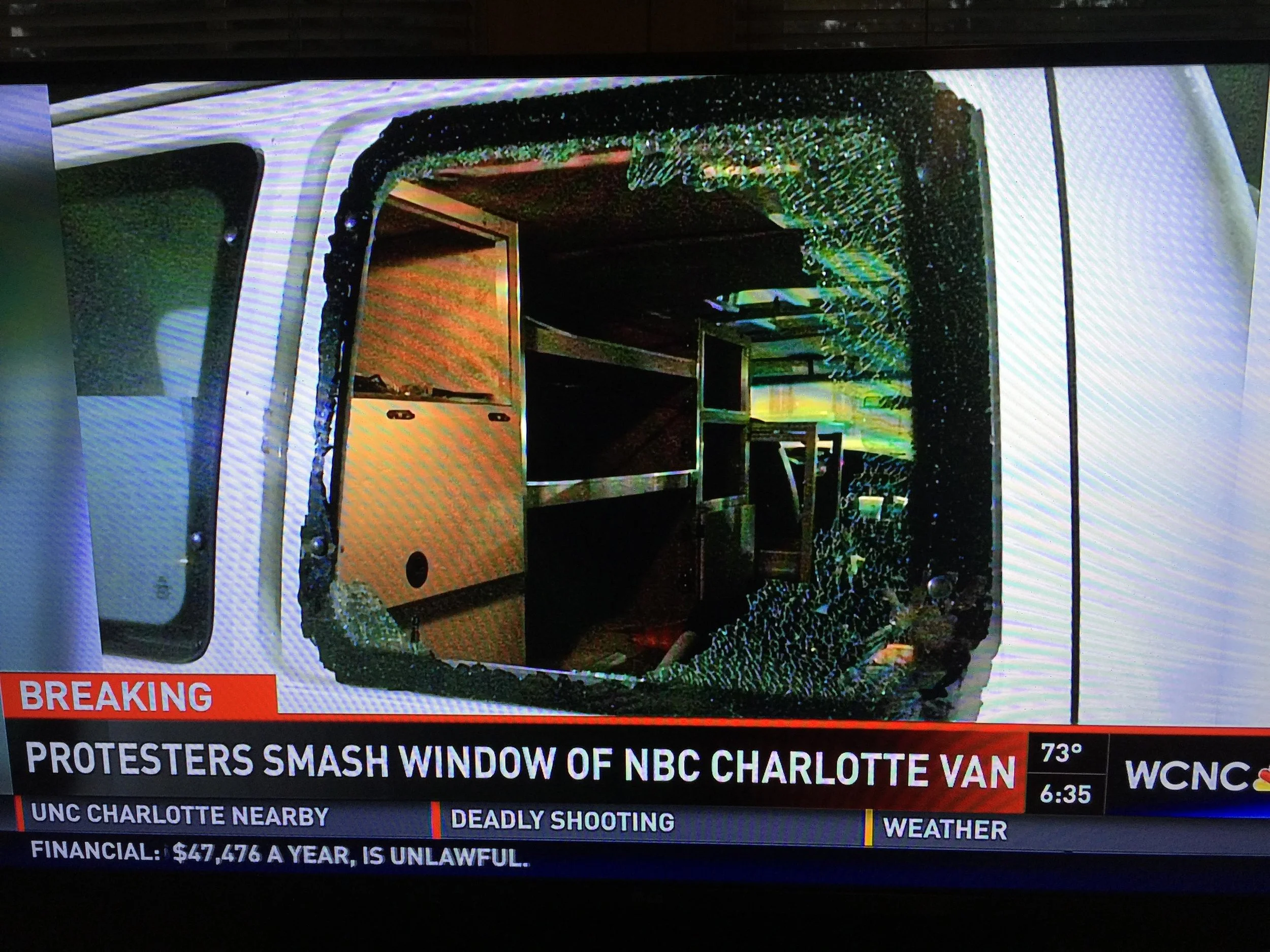 Despite the scores of people hurt, WCNC has been making a big deal over the fact that one of their news vans had the window smashed during the protest. They have been going on and on about this story.