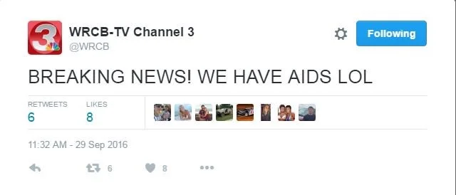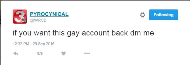 /Poor WRCB-TV in Chattanooga. Someone hacked their Twitter account and took it for a few laps around the block, before things got back to normal.
