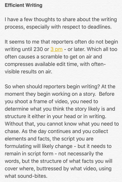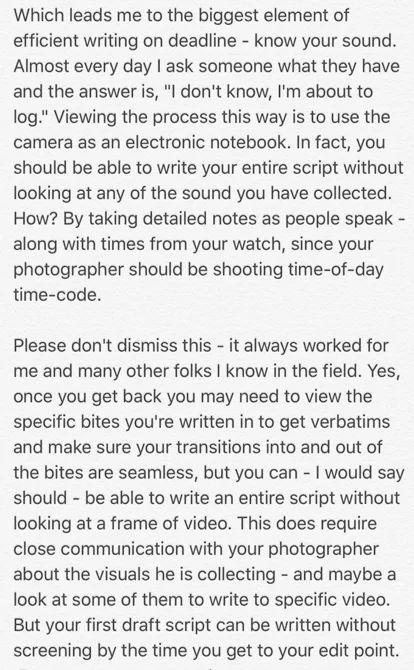 Now, the creator of Diners, Drive-ins and Dives, is giving tips on how to write news scripts. One of them is to, "determine what you think the story likely is and then structure it either in your head or in writing." Keep in mind, Page says that should be done before a single frame of video is shot and probably before you even leave the station.