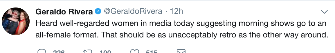 It was right about now that Fox News released this statement and we're thinking a call was placed to Rivera. "Geraldo's tweets do not reflect the views of Fox News or its management. We were troubled by his comments and are addressing them with him," the network said.