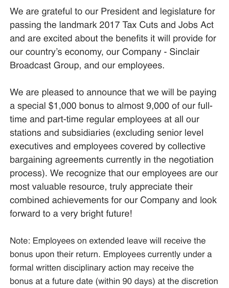 As FTVLive told you earlier today, Sinclair is sharing a very small part of their huge corporate tax cuts with their employees.