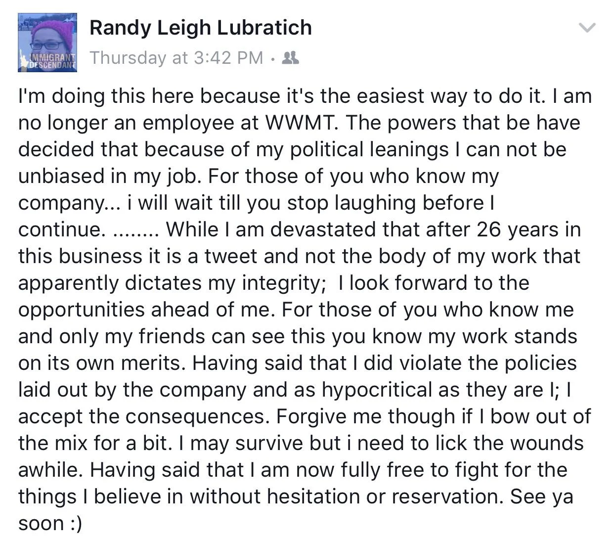 Former EP Randy Lubratich took to Facebook to confirm that she was fired because she did not lean far enough to the right for the Sinclair suits.