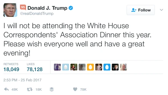 /President Trump says he's skipping the annual White House Correspondents' Association Dinner, this year. It'll be the first time in 36 years, since a president hasn't attended. Ronald Reagan missed the dinner in 1981, but that's because he was recovering from being shot in an assassination attempt.