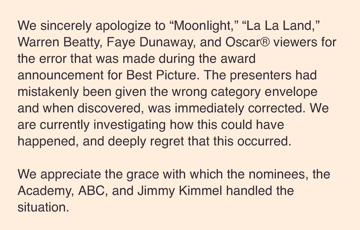 Here's the statement from Price Waterhouse Coopers, who screwed it up and now should basically change their name, because they will be the butt of jokes for years to come for the mistake.