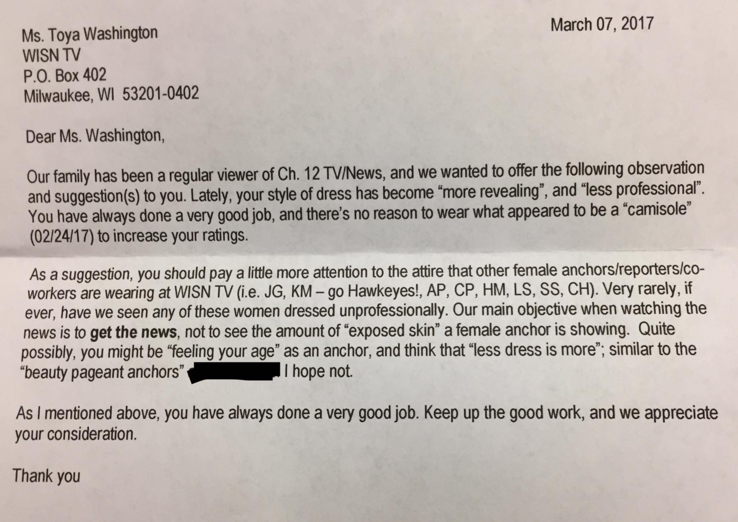 WISN (Milwaukke) Anchor Toya Washington got an anonymous letter in the mail (people still mail stuff) saying that, “Lately, your style of dress has become ‘more revealing’ and ‘less professional’ … and there’s no reason to wear what appeared to be a ‘camisole’ … to increase your ratings.”