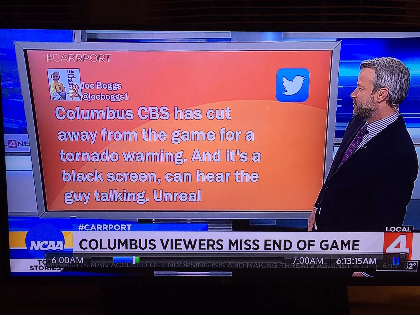 WBNS in Columbus, cut away from the NCAA game between the University of Kentucky and the University of North Carolina for a tornado warning.