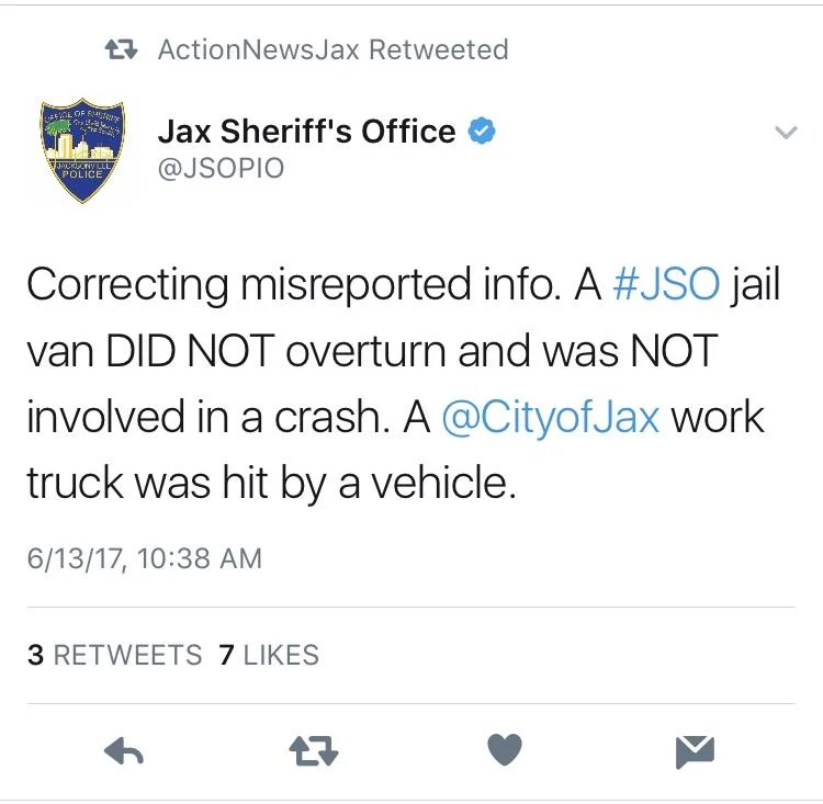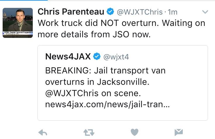The Jacksonville Sheriff's Office also jumped on Twitter to correct the wrong reports. In fact they added that their jail transport van was not only not tipped over, it wasn't even involved in a crash.