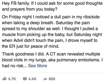 KYW's Kate Bilo said she was feeling sharp pains whenever she'd take a deep breath. She decided to have it checked out and it's a good thing she did. A CT scan revealed she had several blood clots in her lungs. Bilo made the announcement on her Facebook.