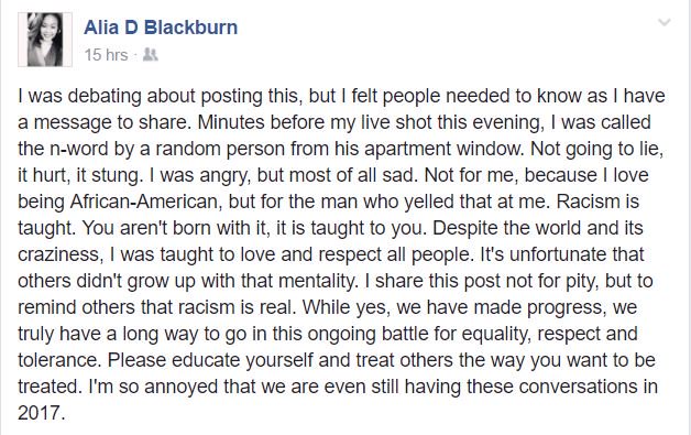 /WTHI (Terre Haute) Anchor/Reporter Alia Blackburn was getting ready to do a live hit. Just before it was tossed to her, a person yelled out their window calling Blcakburn a "Ni*ger."