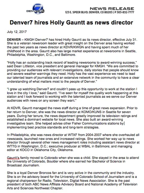 I wanted to let everyone know that Holly Gauntt will be leaving us – she has accepted the open news director position at KMGH. Holly told me this morning and said that, although it was a difficult decision, she thinks it is the best move for herand her family. Holly joined our team a little over two years ago, led significant news expansion and launched the “Problem Solvers” brand on FOX31. I’d like to thank her for her dedication, leadership and efforts to help us build our news product on FOX31 and KWGN.