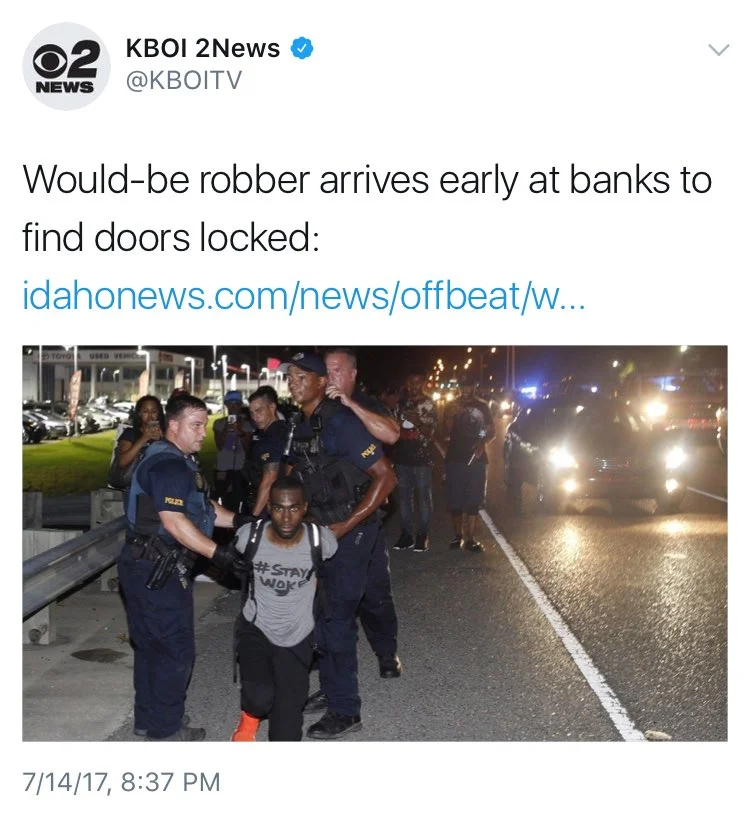 That black man did not try and rob a bank, in fact he is well known Black Lives Matter activist and educator DeRay McKesson. But hey, he's black and obviously to the Sinclair station in Idaho, it's all the same.