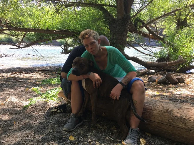 Brown says she has been living at the camp for about two months. She says she's been on the waiting list for low-income housing for two years and has nowhere else to go. Before moving with her dog Mister to the banks of the Spokane River, she lived on the streets downtown.