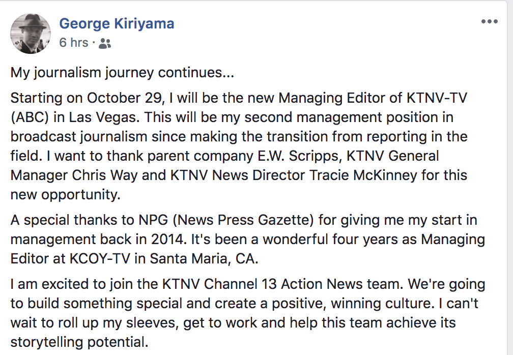 Former San Francisco Reporter George Kiriyama has made the move to the dark side, news management.