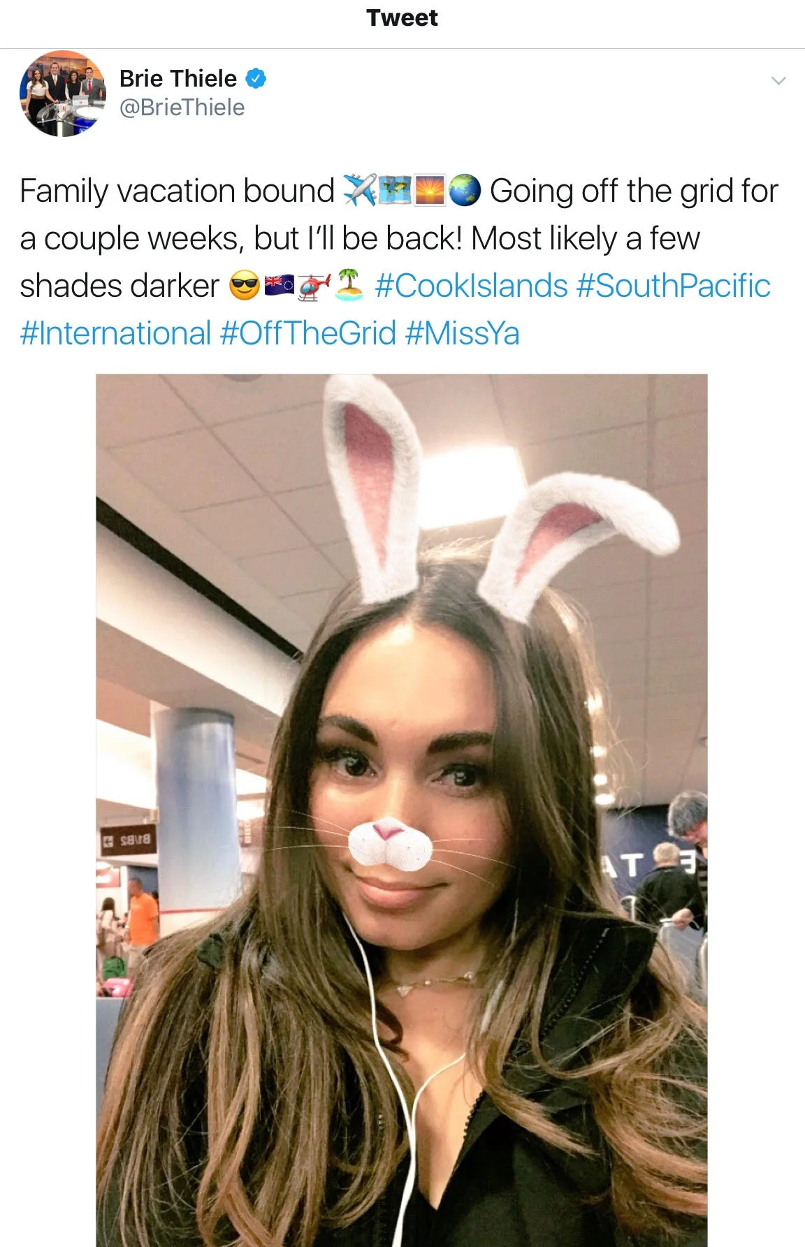 /WKRN (Nashville) Traffic Anchor Brie Thiele tweeted out that she is going to be off the air for awhile, while she vacations in the South Pacific (where apparently you wear bunny ears and a nose).