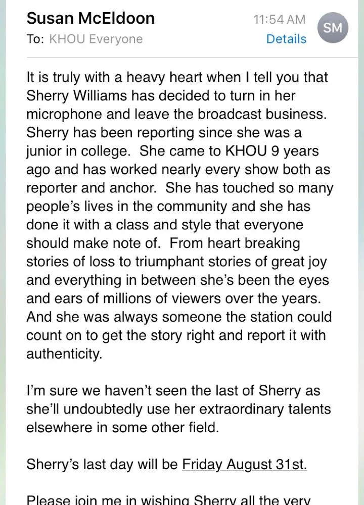 /Longtime KHOU Reporter Sherry Williams is leaving the Tegna station and the TV news business altogether.