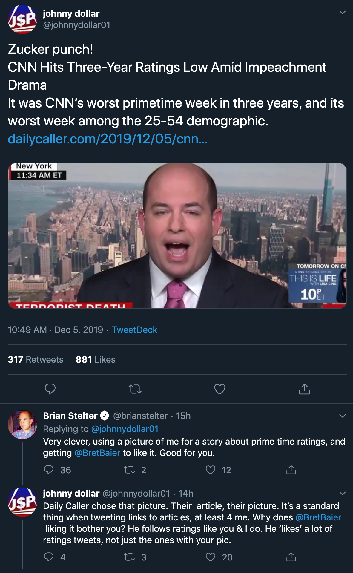 Stelter was also mad that somehow Johnny Dollar got Fox News Anchor Bret Baier to “Like” the tweet.