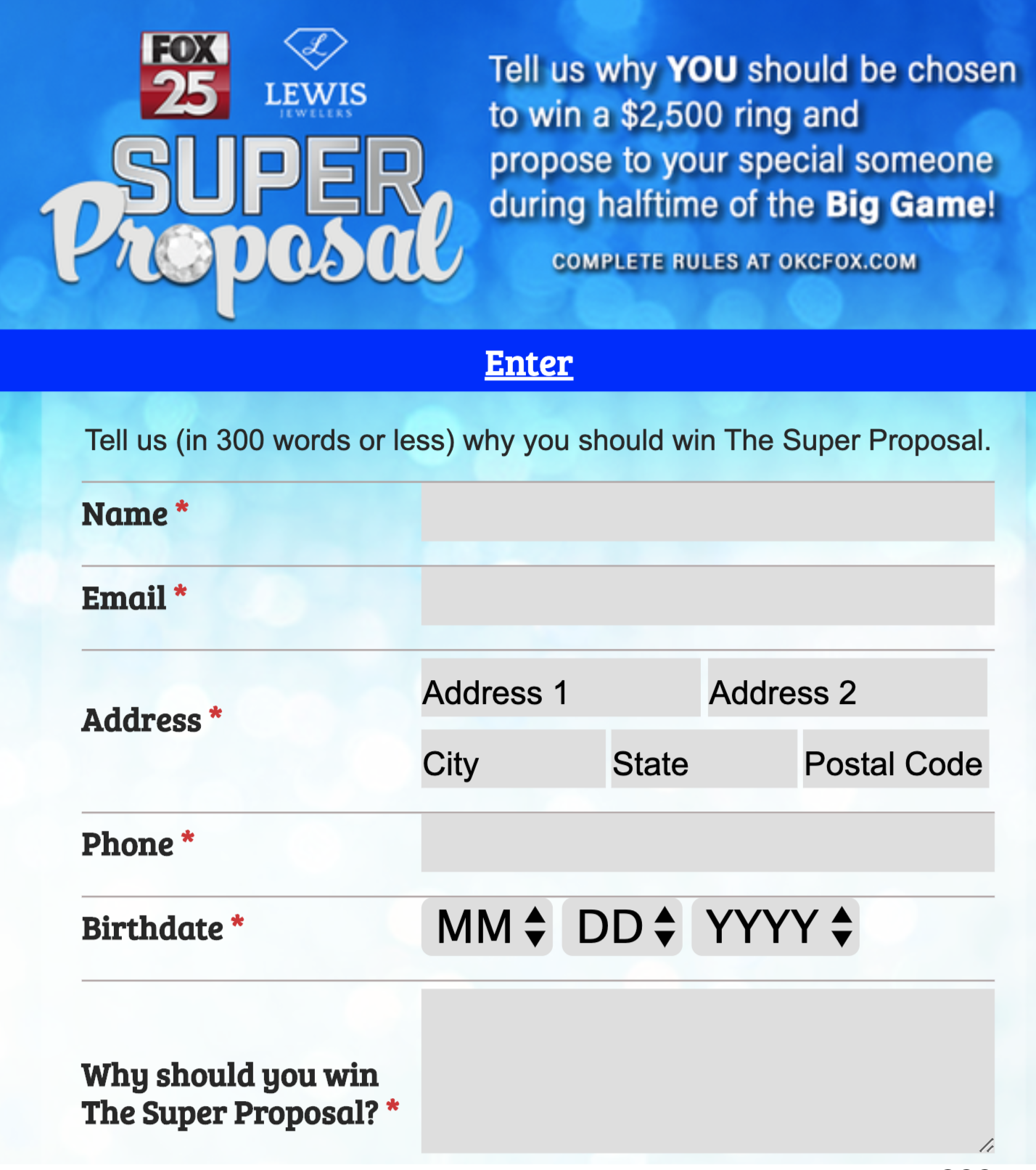 The station has teamed up with a local jeweler and is asking viewers to submit if they want to propose to their “special someone” during halftime of the Super Bowl.