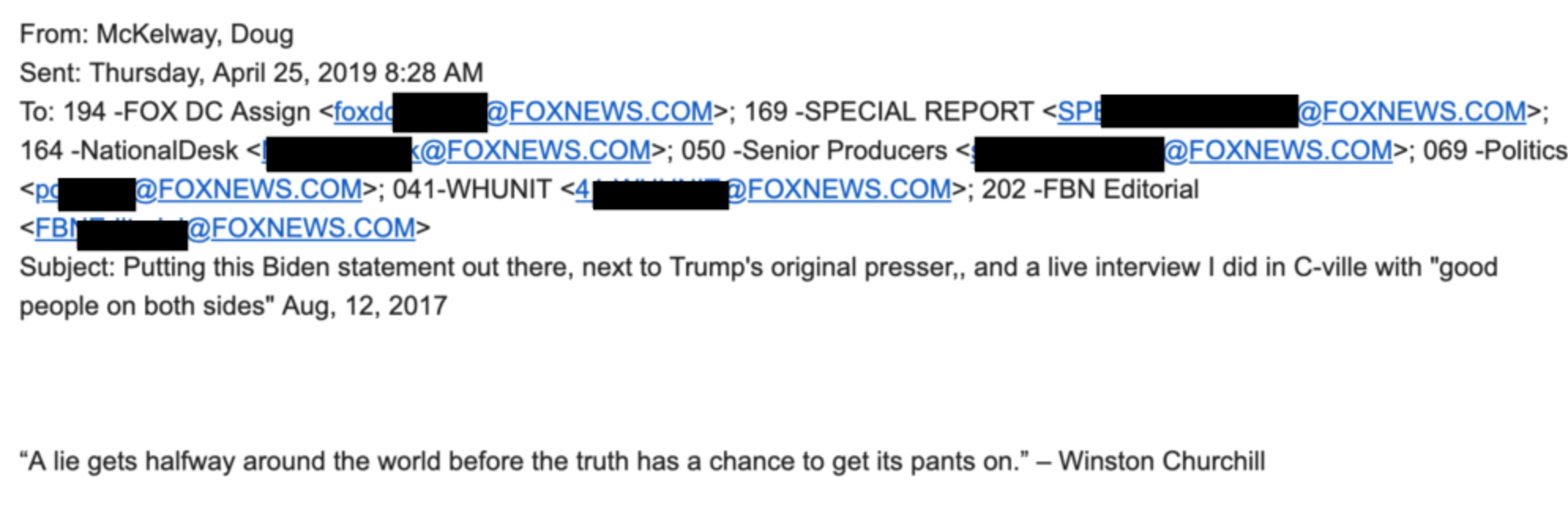 Fox News Reporter Doug McKelway sent an email to his colleagues that basically said that Biden was lying and he quoted Winston Churchill.