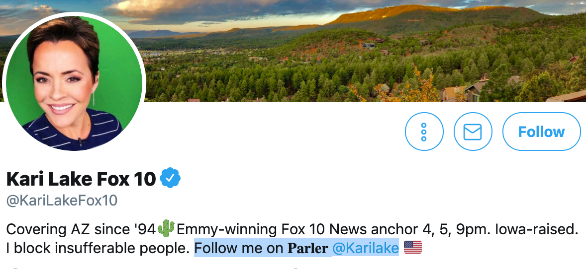 /4 days ago, FTVLive told you that KSAZ Anchor Kari Lake included a link on her Twitter account to her profile on the Alt-Right social media website “Parler.”