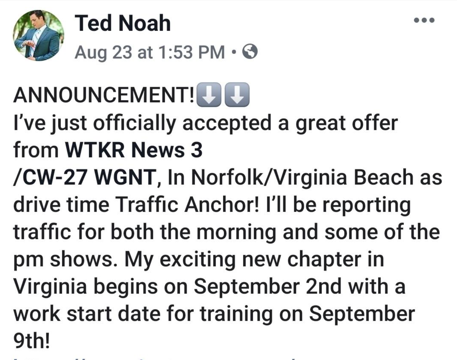 Well, Noah will be back playing in traffic next month on WTKR’s Norfolk) newscasts. He posted the news to his social media: