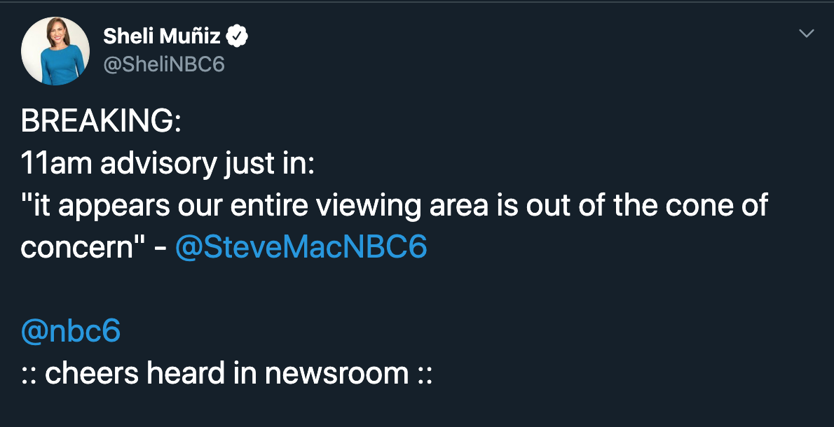 /When the word came down that Dorian was expected to make a turn and not impact South Florida, WTVJ’s Sheli Muñiz posted that there were “cheers in the newsroom”: