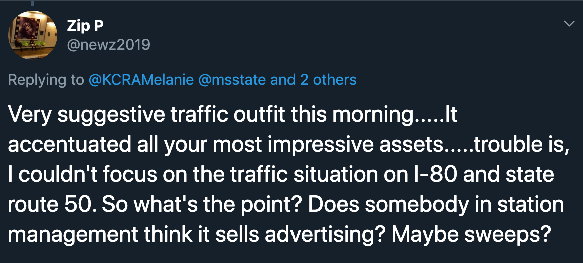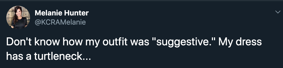 /It seems that KCRA (Sacramento) Traffic Anchor Melanie Hunter wore an outfit that was too “suggestive” for one viewer.