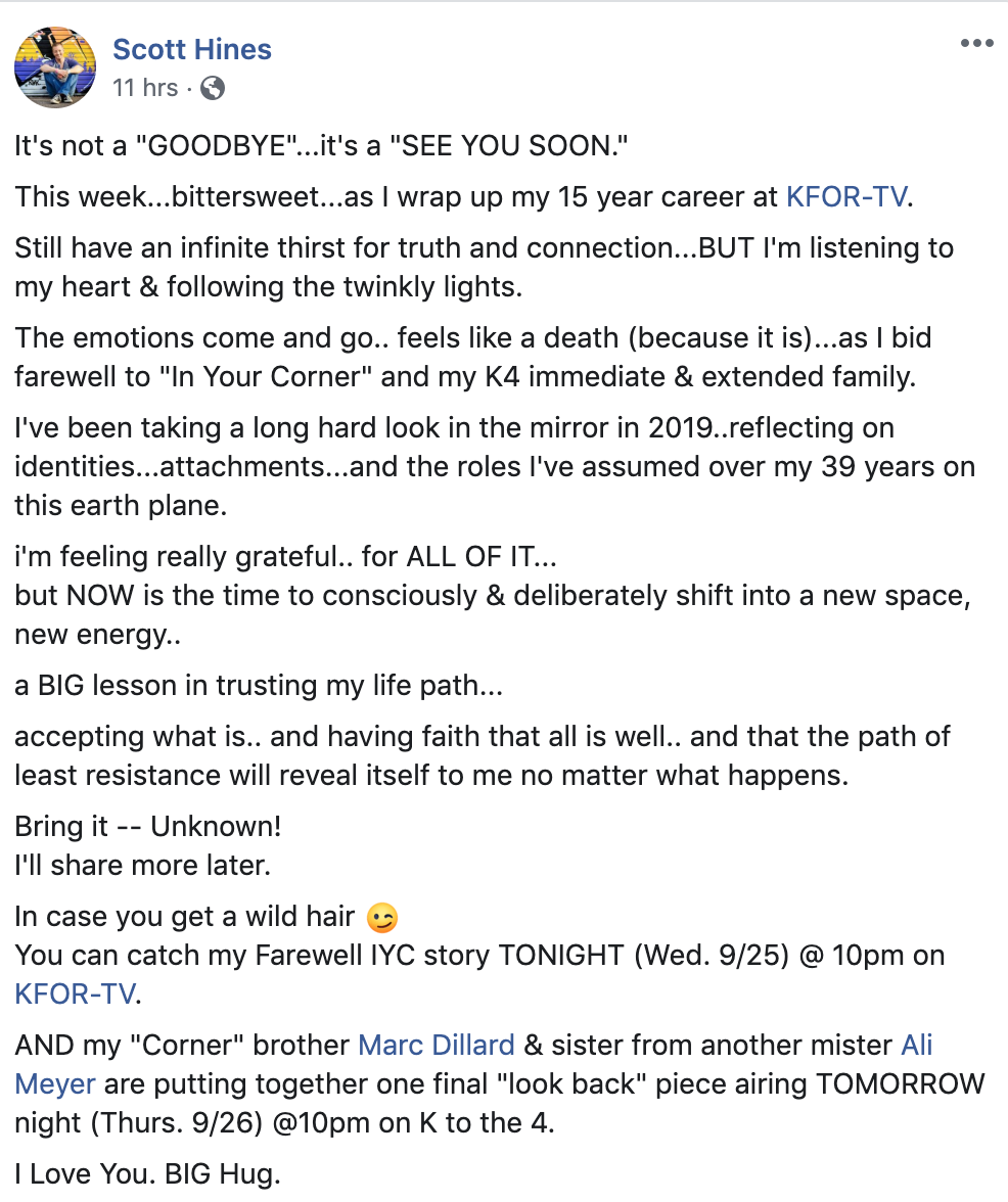 It appears that KFOR Reporter Scott Hines is leaving the corner.
