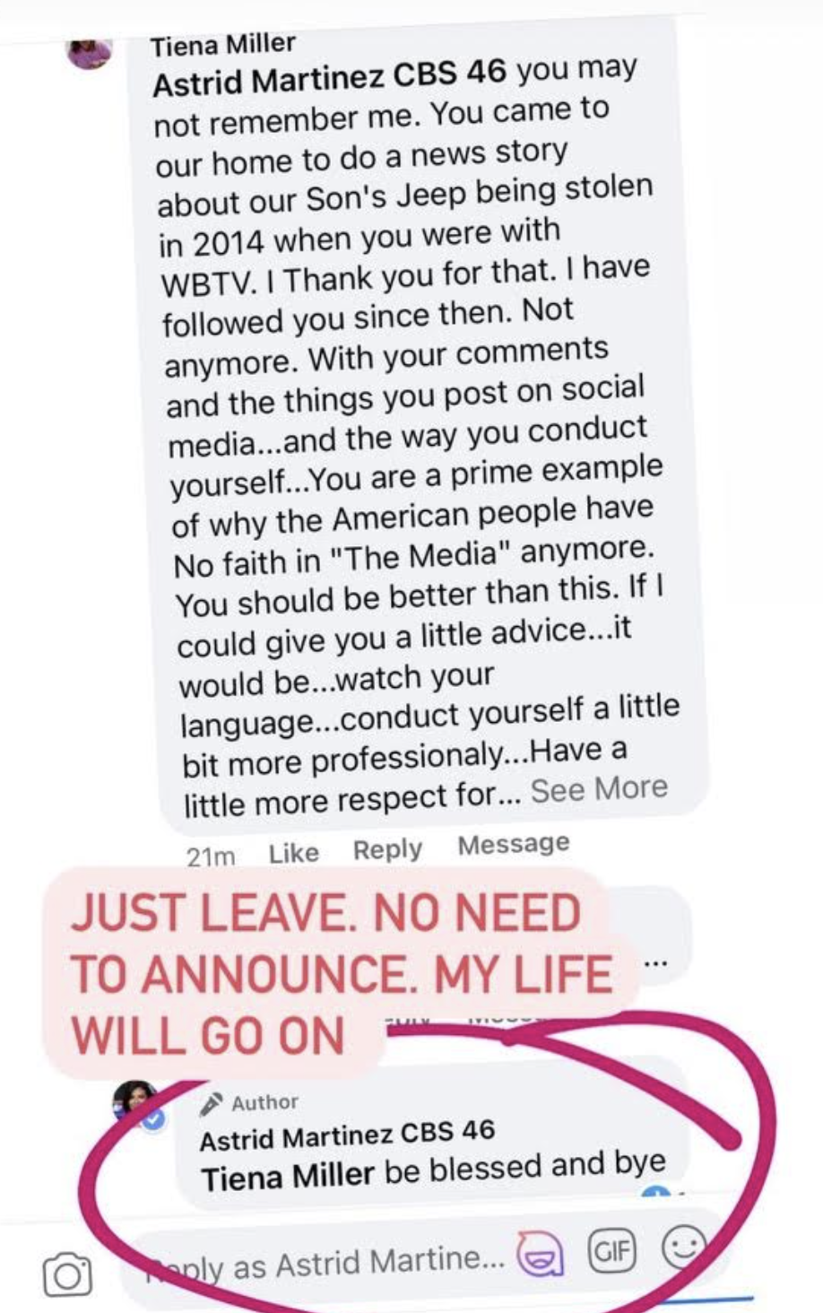 Martinez responded with “Just Leave. No Need to Announce. My Life Will Go on.”