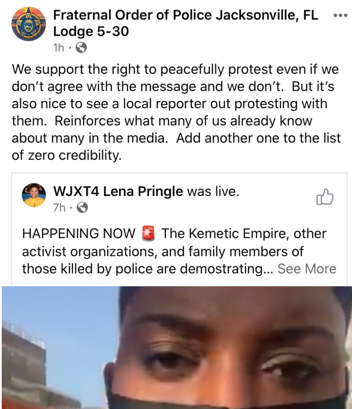 So, some were a bit surprised when the Fraternal Order of Police in Jacksonville linked to her live reporting and accused her of protesting.