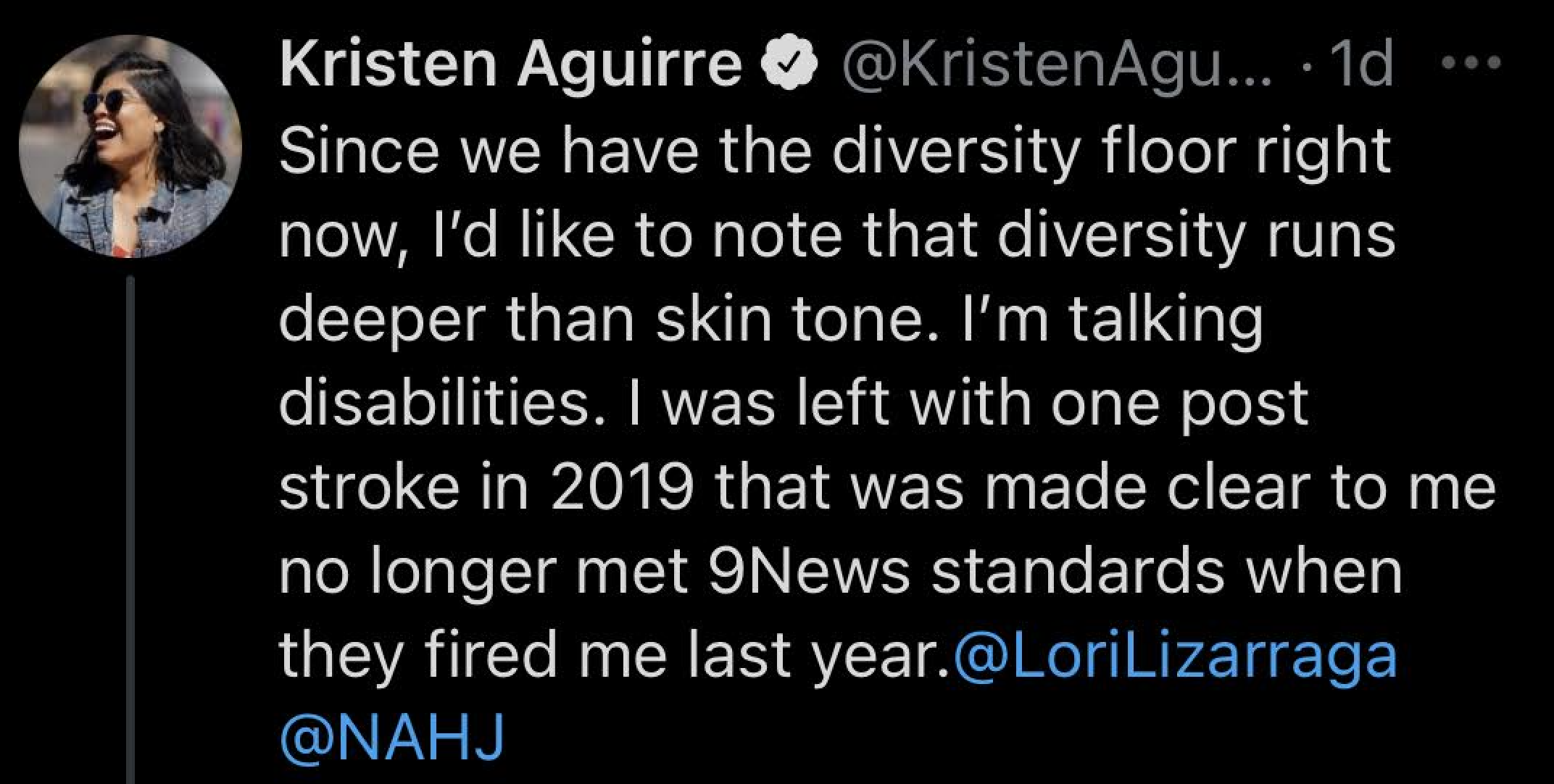 “We worked with Kristen and her medical team to do everything we could to support her in redeveloping her abilities following her stroke,” the statement said. “We have and continue to wish her well. We are confident that our station provided appropriate, reasonable accommodations to assist Kristen on her path toward recovery. Additionally, 9NEWS has diversity programs in place and is committed to an inclusive and diverse environment for all employees.”