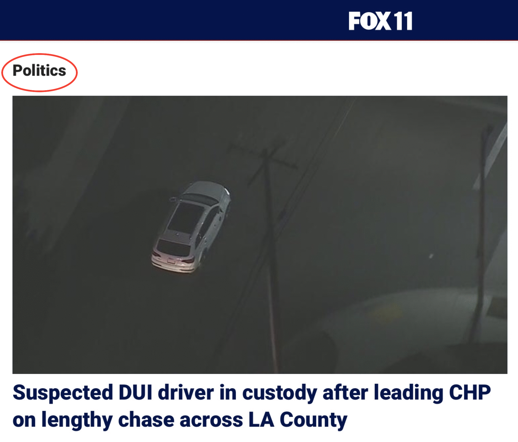 November 18, 2021 Only in LA November 18, 2021/ Scott Jones Only in LA does a TV station consider a car chase “politics”…..