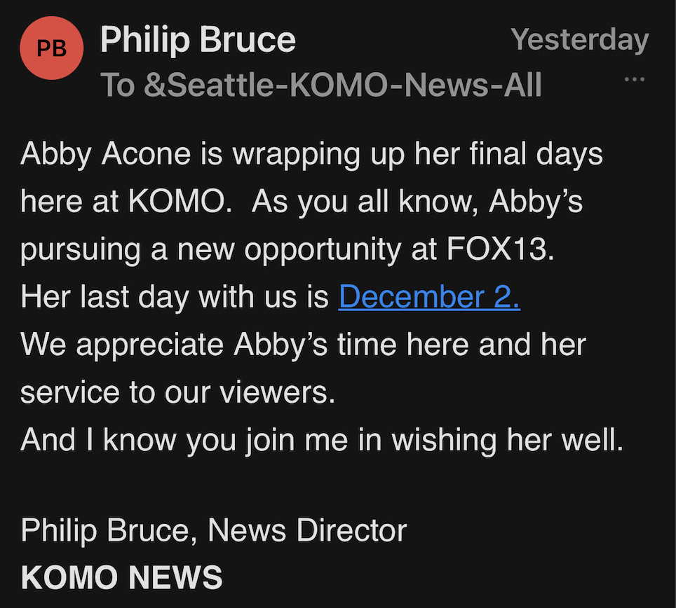 A memo has finally gone out to the staff at KOMO that confirmed what FTVLive first reported.