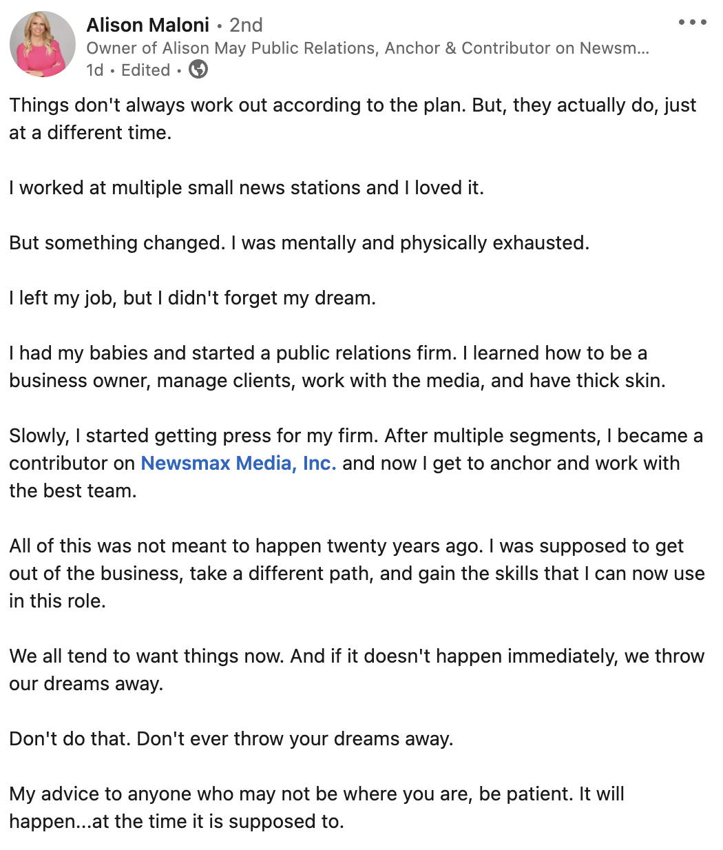 She posted about her new adventure and tells people not to give up on your dream. Even if your dream to is to for NewsMax.