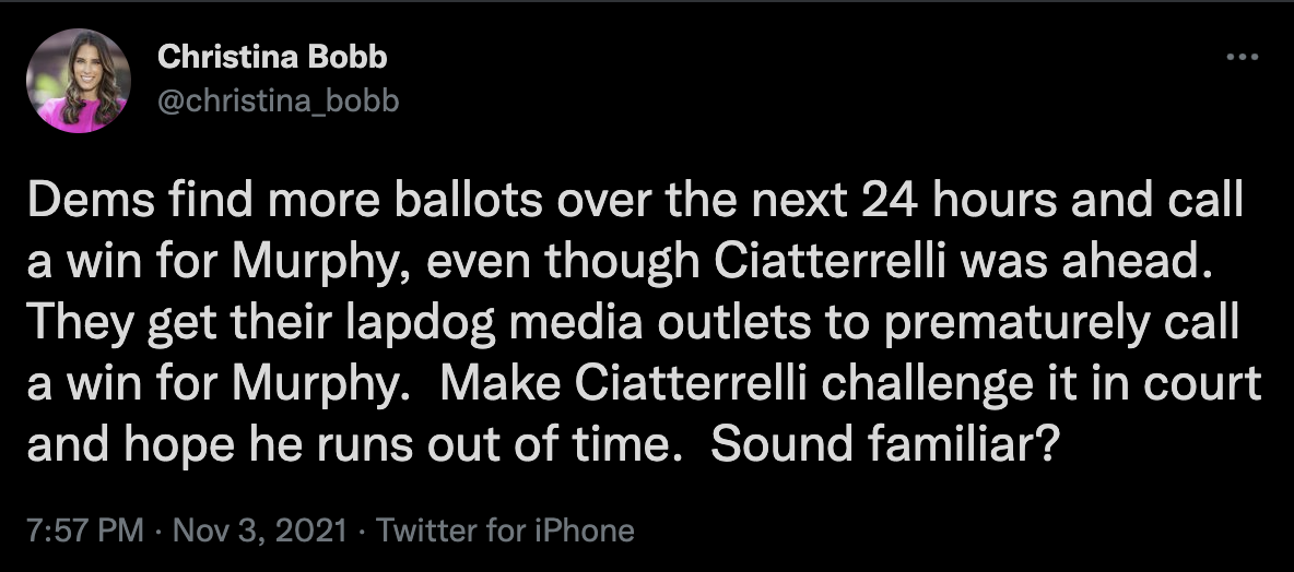 While One American News host Christina Bobb saw no problems with the GOP win in Virginia, she was quick to jump on the GOP loss in New Jersey and start claiming it was rigged.