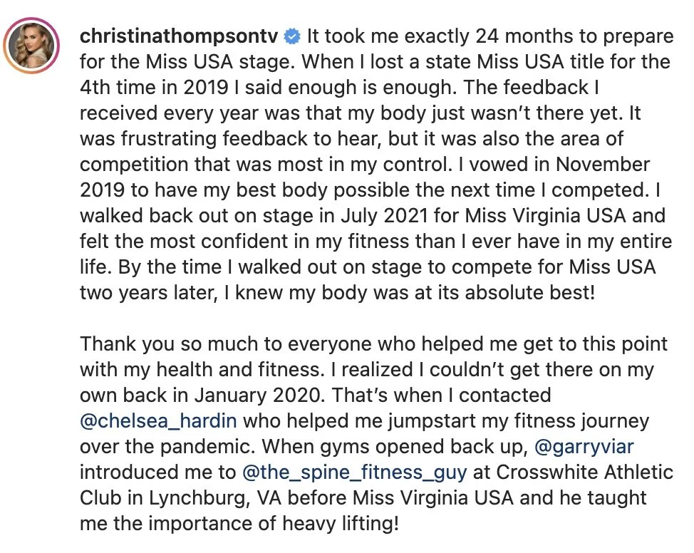 /5 days ago, Christina Thompson posted about how she could not do well on the Miss USA stage, because all the feedback was that her “body just wasn’t there yet.”