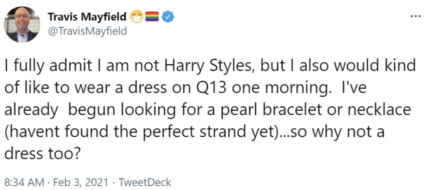 /Yesterday, FTVLive posted a story in which KCPQ (Seattle) Anchor Travis Mayfield posted a tweet about going on the newscast wearing a dress.