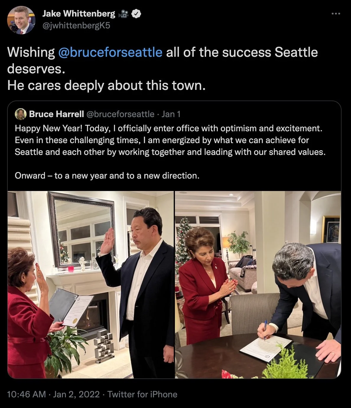/It seems a bit odd that KING (Seattle) Morning Anchor Jake Whittenberg is sucking up to newly elected Seattle Mayor Bruce Harrell on social media.