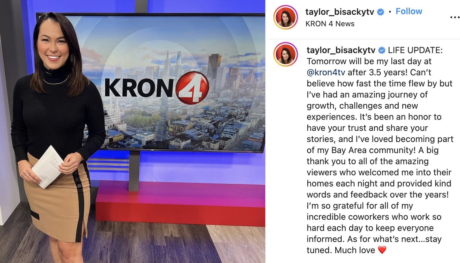 /KRON MMJ Taylor Bisacky is leaving the Nexstar station. She posted the news to her social media.
