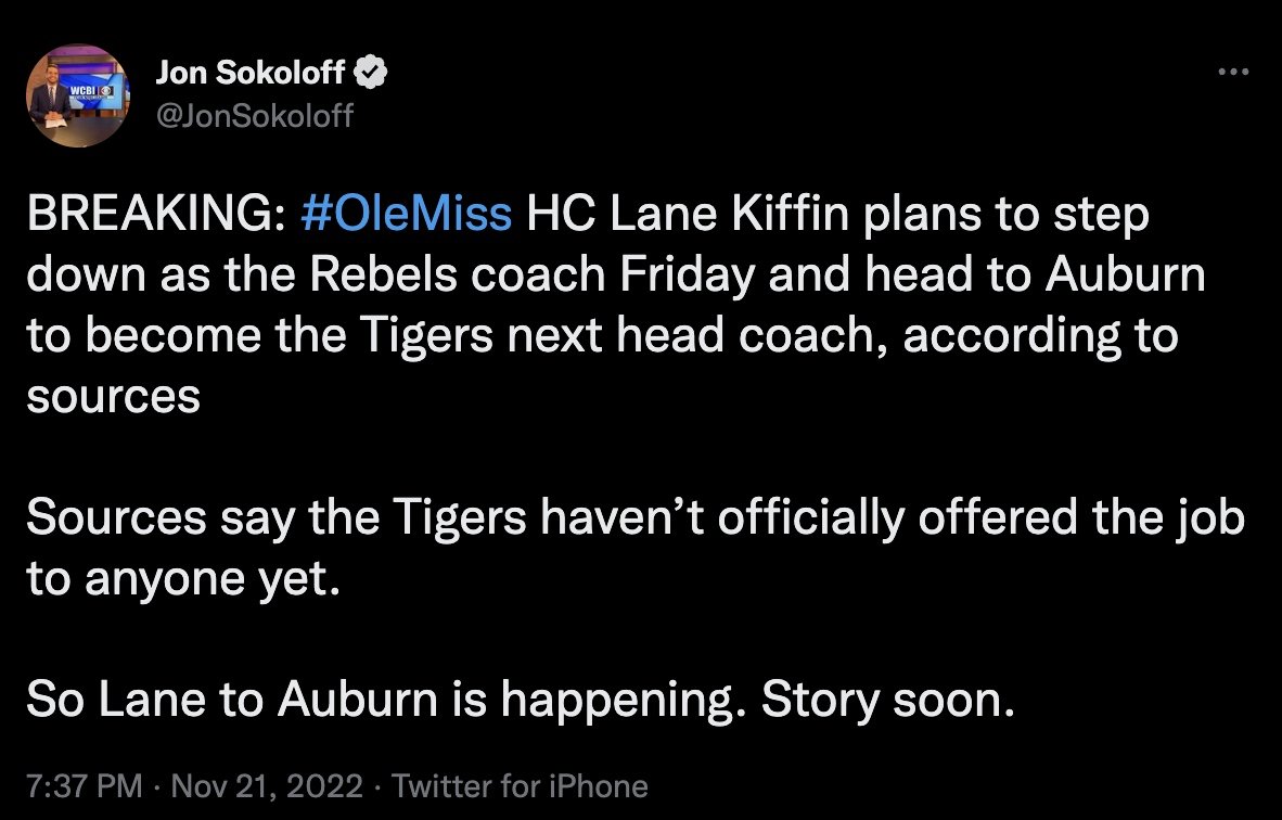 /On November 21st, WCBI (Tupelo) Sports Director Jon Sokoloff posted news of a big change going to happen in the college football ranks.