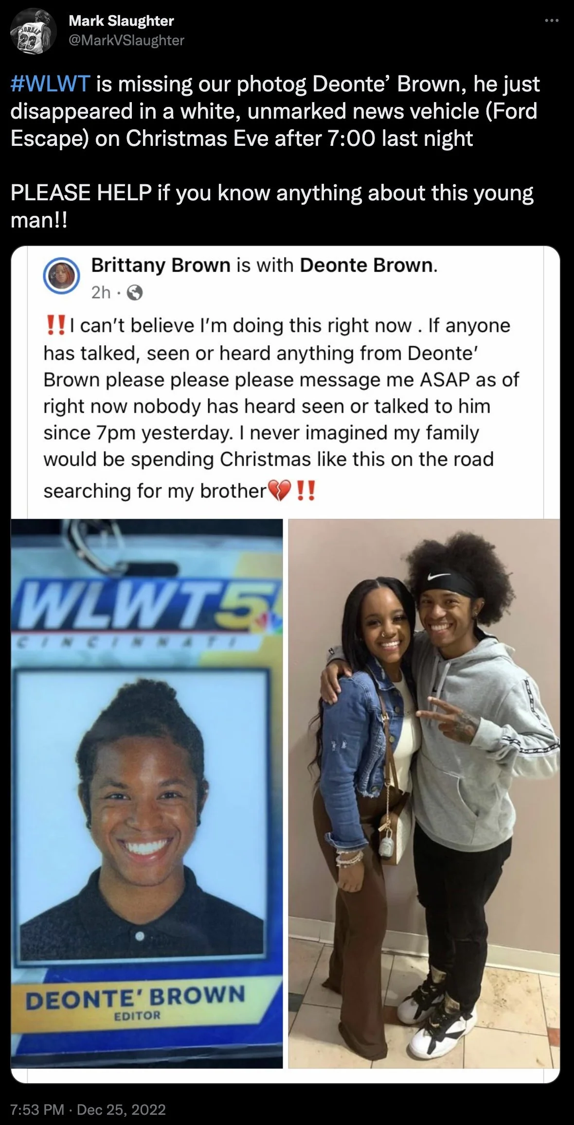 Photographer Deonte' Brown was last seen in a station news car on Christmas Eve. His family is looking for him, along with co-workers, but the station has not said anything about the missing Photog.