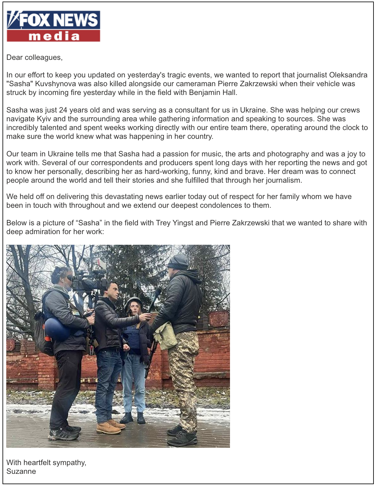 Now word comes from Fox News that Ukrainian journalist Oleksandra "Sasha" Kuvshynova was also killed in the attack.